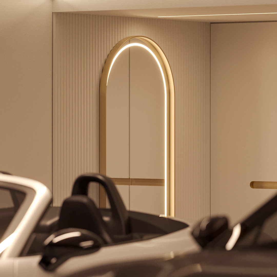 Another highlight of this project is an elevated walkway reminiscent of a catwalk, transforming the space into a captivating stage. Perfectly illuminated by soft lighting, it leads directly to a large mirror. This moment is intentionally staged to turn the transition from home to the outside world into a unique experience. For the lady of the house, this walkway becomes a stage, offering a special moment to embrace her femininity, step into her car with confidence and positivity, and head out ready to conquer the world.