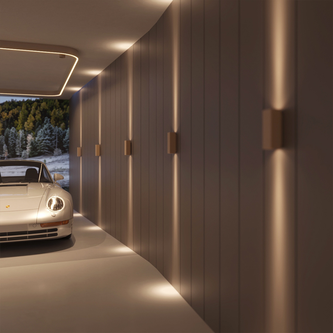The far end of this underground garage was dark. So we brought light into it — but not with a fixture. With an image. A large-format, backlit panoramic photograph that fills the entire wall and transforms the space.
